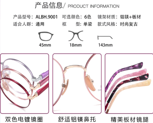3,眼鏡框不僅用於矯正視力問題,如近視、遠視、散光等,還成爲了一種時尚的附屬品。因此廠家提供了多種鏡框顔色來滿足我們的搭配需求。這很好的解決了我們日常妝容、服飾與鏡框顔色的搭配難題。