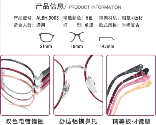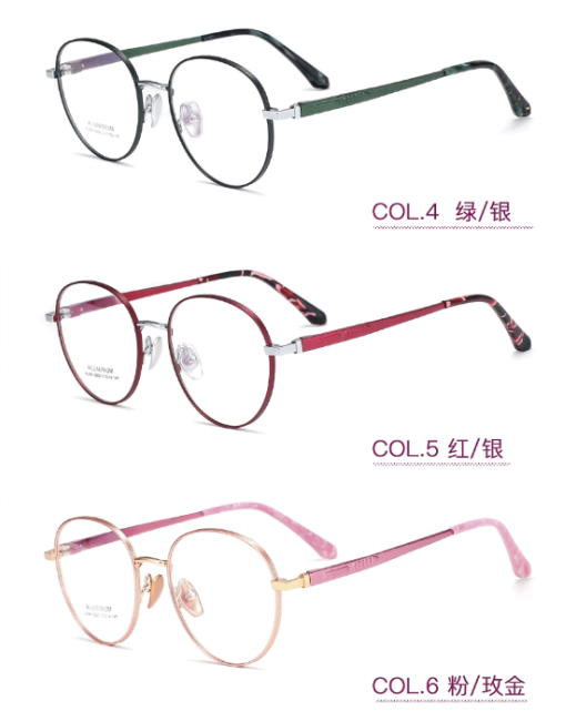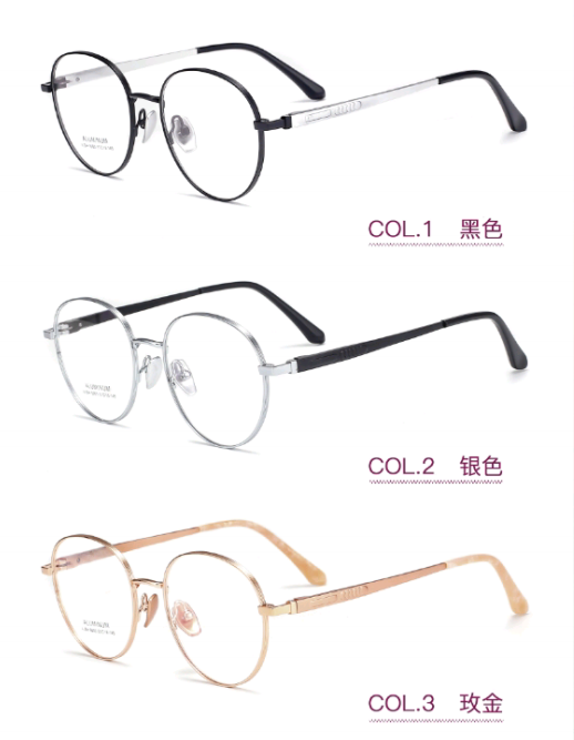 3,眼鏡框不僅用於矯正視力問題,如近視、遠視、散光等,還成爲了一種時尚的附屬品。因此廠家提供了多種鏡框顔色來滿足我們的搭配需求。這很好的解決了我們日常妝容、服飾與鏡框顔色的搭配難題。