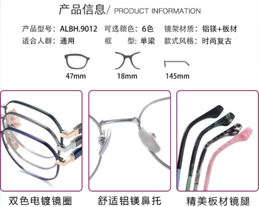 3,眼鏡框不僅用於矯正視力問題,如近視、遠視、散光等,還成爲了一種時尚的附屬品。因此廠家提供了多種鏡框顔色來滿足我們的搭配需求。這很好的解決了我們日常妝容、服飾與鏡框顔色的搭配難題。