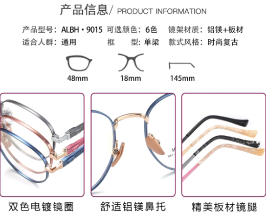 3,眼鏡框不僅用於矯正視力問題,如近視、遠視、散光等,還成爲了一種時尚的附屬品。因此廠家提供了多種鏡框顔色來滿足我們的搭配需求。這很好的解決了我們日常妝容、服飾與鏡框顔色的搭配難題。