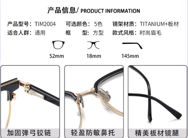 3,眼鏡框不僅用於矯正視力問題,如近視、遠視、散光等,還成爲了一種時尚的附屬品。因此廠家提供了多種鏡框顔色來滿足我們的搭配需求。這很好的解決了我們日常妝容、服飾與鏡框顔色的搭配難題。